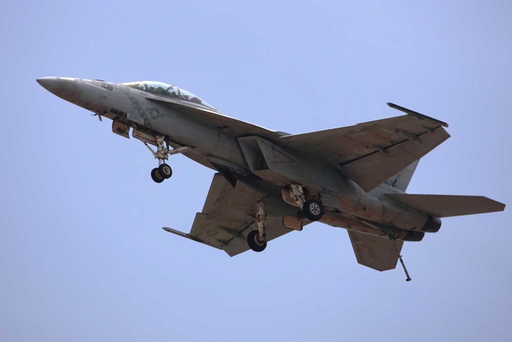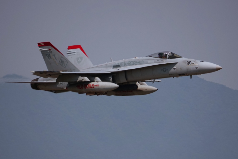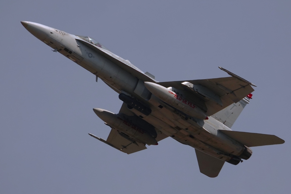 続いて、米軍の各種戦闘機による飛行展示の写真。はじめに書いた通り、このとき、初めてF/A-18F型支援戦闘機の機動飛行を見る/撮ることができた。また、レッド・デビルス所属のF/A-18C型機”レガシーホーネット”の飛行展示があった。