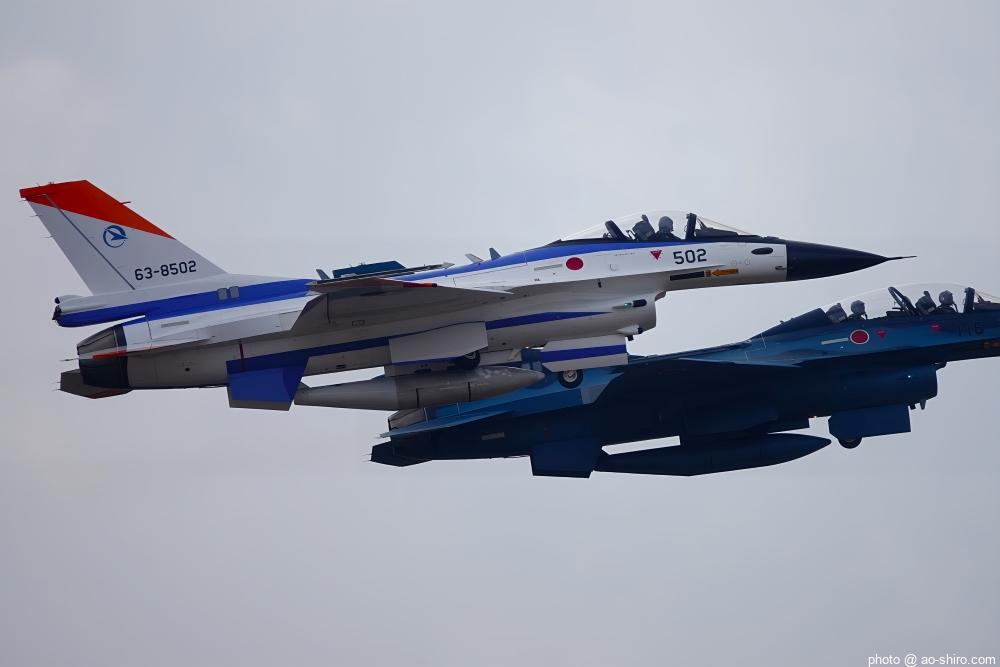 地元機のT-4中等練習機、T-400基本操縦練習機、U-125A救難捜索機、UH-60J救難ヘリコプターの展示飛行もあったが、私のお目当ては岐阜基地所属のF-15J戦闘機とF-2A支援戦闘機の機動飛行。特にF-2A支援戦闘機は、私が最も好きなテスターカラーで彩られた502号機で嬉しかった。