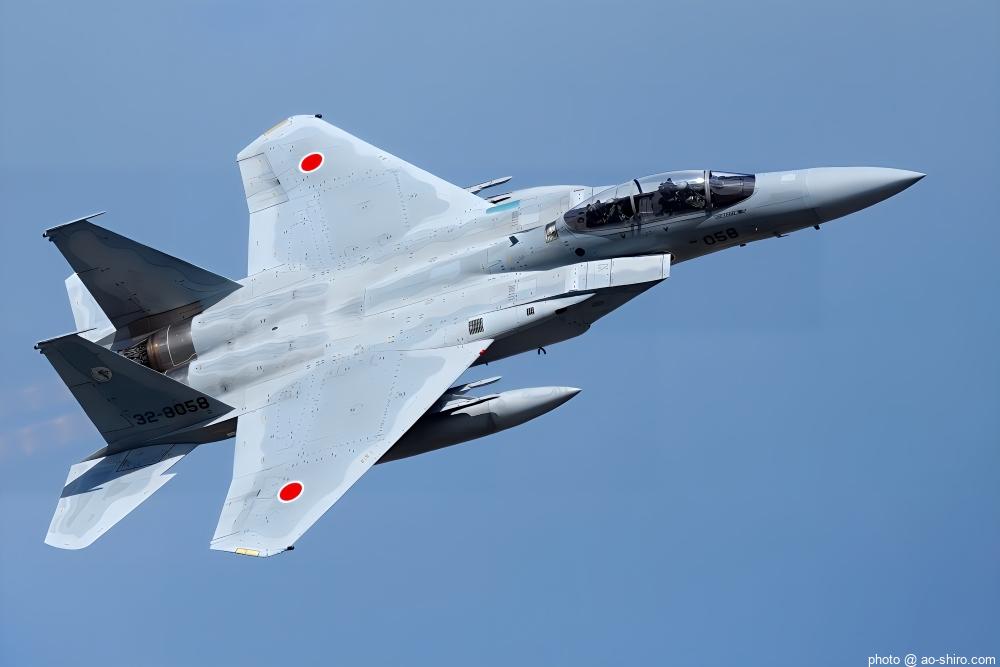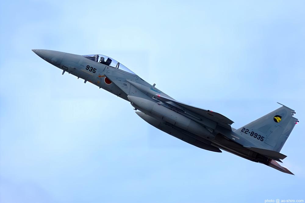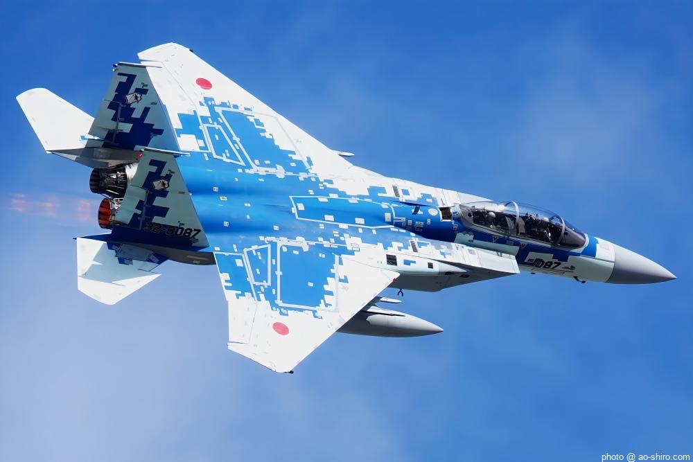 今回の航空祭のトリは、第306飛行隊所属のF-15J戦闘機2機による機動飛行だった。1機は普通塗装のF-15J、もう1機は「日伊共同訓練記念塗装機」のF-15Jだった。