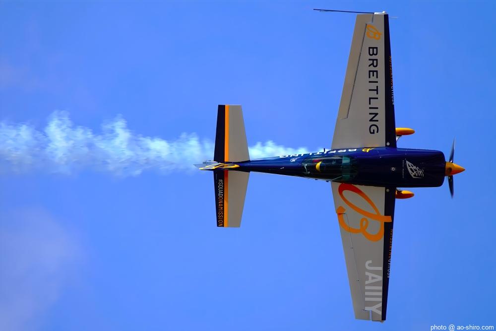 室屋さんの曲技飛行は、築城基地や岩国基地、小牧基地などの航空祭で見ていたが、小松基地でのフライトは今回が初めてだとの紹介があった。使用機材はエクストラEA-300/SCで、相変わらずのキレのよい曲技を披露してくれた。とくに驚いたのは、スモークで空にハートマークを描く曲技。ブルーインパルスの場合は、2機でハートを描くのに対して室屋さんは1機でそれをやり遂げたのだ。本当にお見事というほかはない。