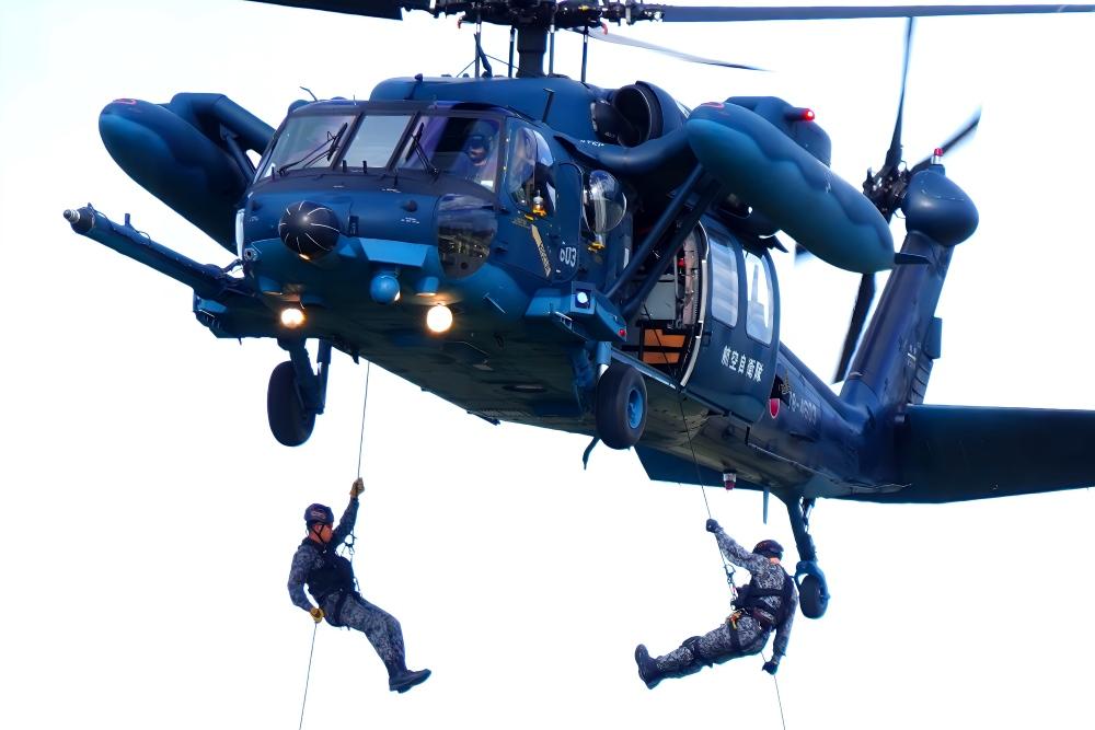 救難訓練飛行は、U-125A救難捜索機とUH-60J救難ヘリコプターによって実施された。U-125Aが会場上空を旋回する中、UH-60Jからラぺリング降下した隊員が要救助者(ダミー人形)を救助する場面を披露してくれた。また、U-125Aは救難物資を空中投下したのだが、残念ながらその瞬間をカメラに収めるのに失敗してしまった(ちょっと残念)。