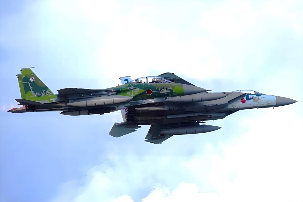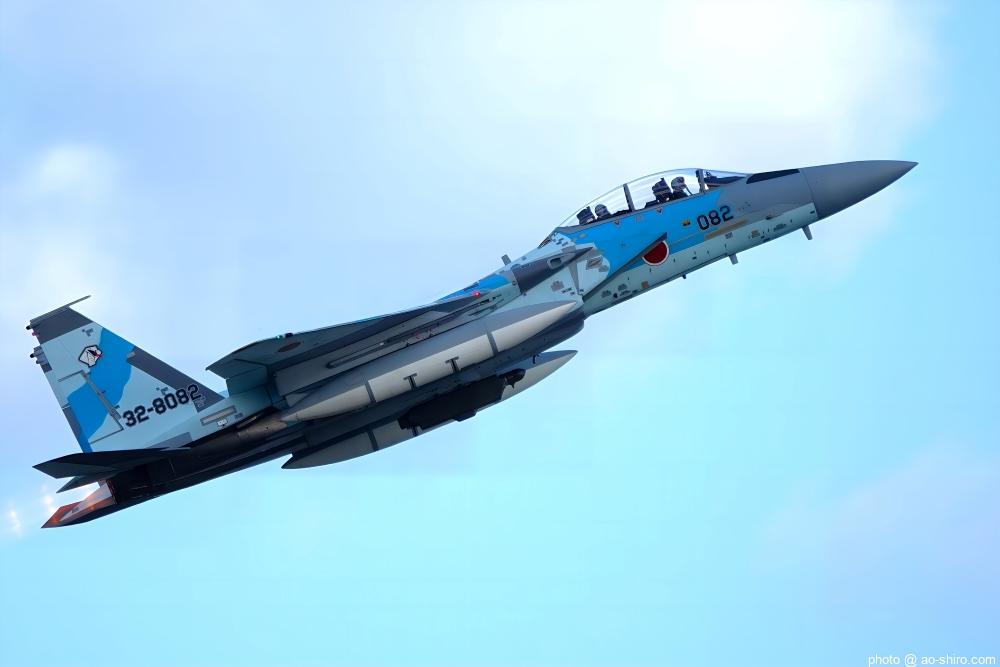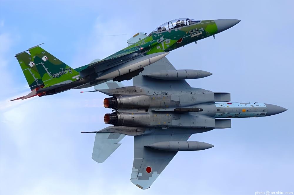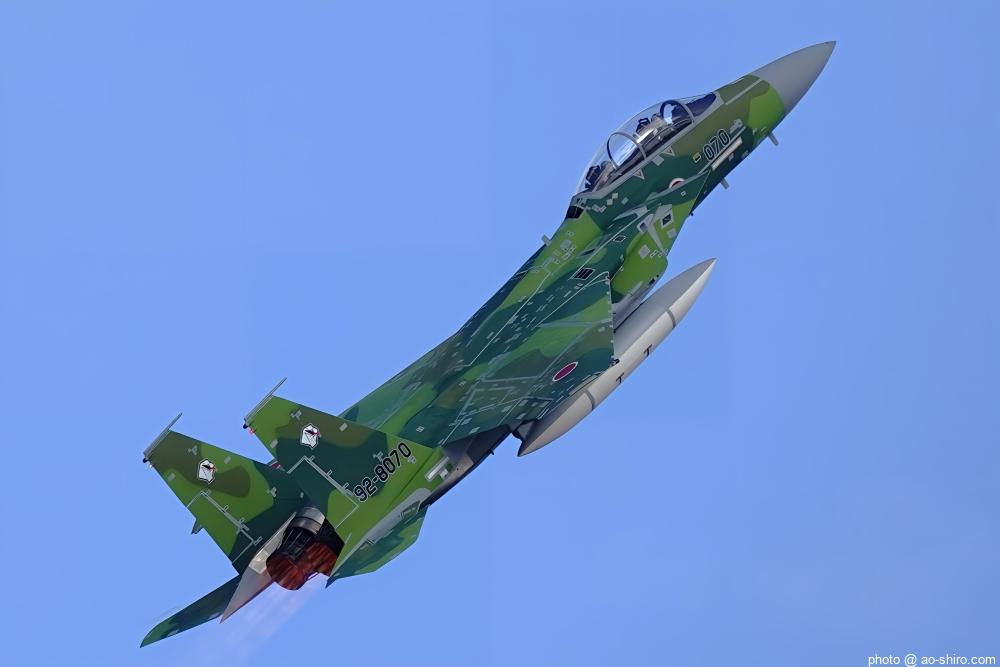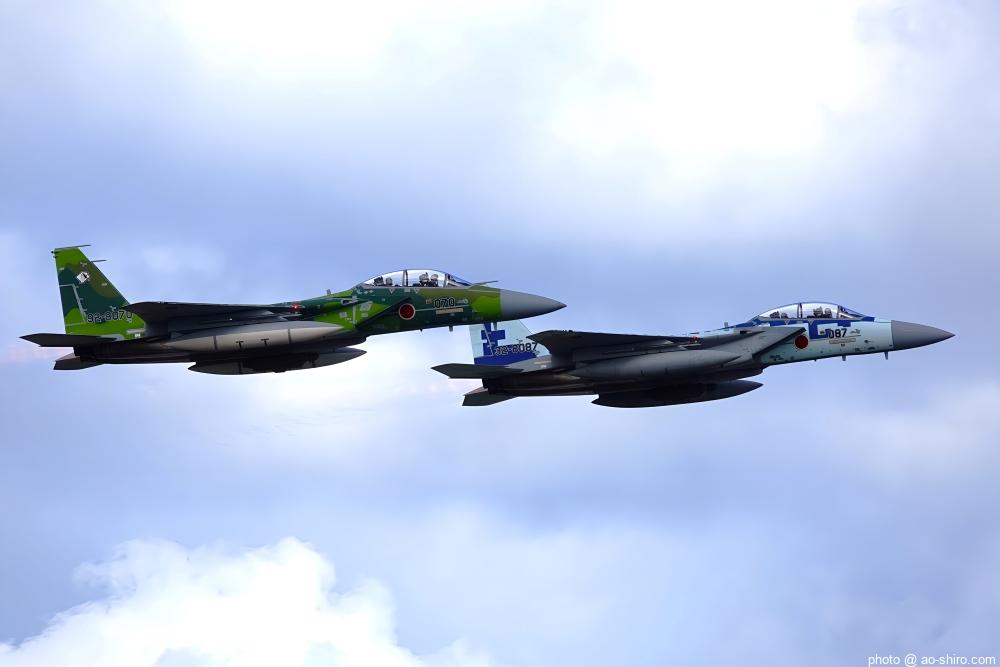 今回の航空祭のトリは、第306飛行隊所属のF-15J戦闘機2機による機動飛行だった。1機は普通塗装のF-15J、もう1機は「日伊共同訓練記念塗装機」のF-15Jだった。