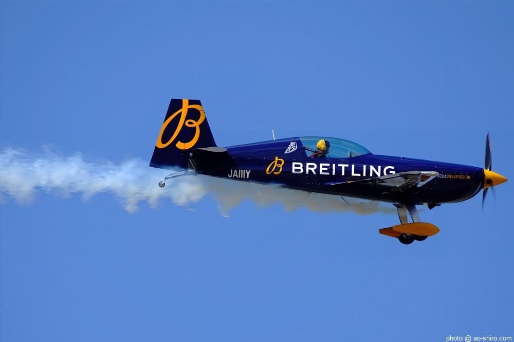 室屋さんの曲技飛行は、築城基地や岩国基地、小牧基地などの航空祭で見ていたが、小松基地でのフライトは今回が初めてだとの紹介があった。使用機材はエクストラEA-300/SCで、相変わらずのキレのよい曲技を披露してくれた。とくに驚いたのは、スモークで空にハートマークを描く曲技。ブルーインパルスの場合は、2機でハートを描くのに対して室屋さんは1機でそれをやり遂げたのだ。本当にお見事というほかはない。