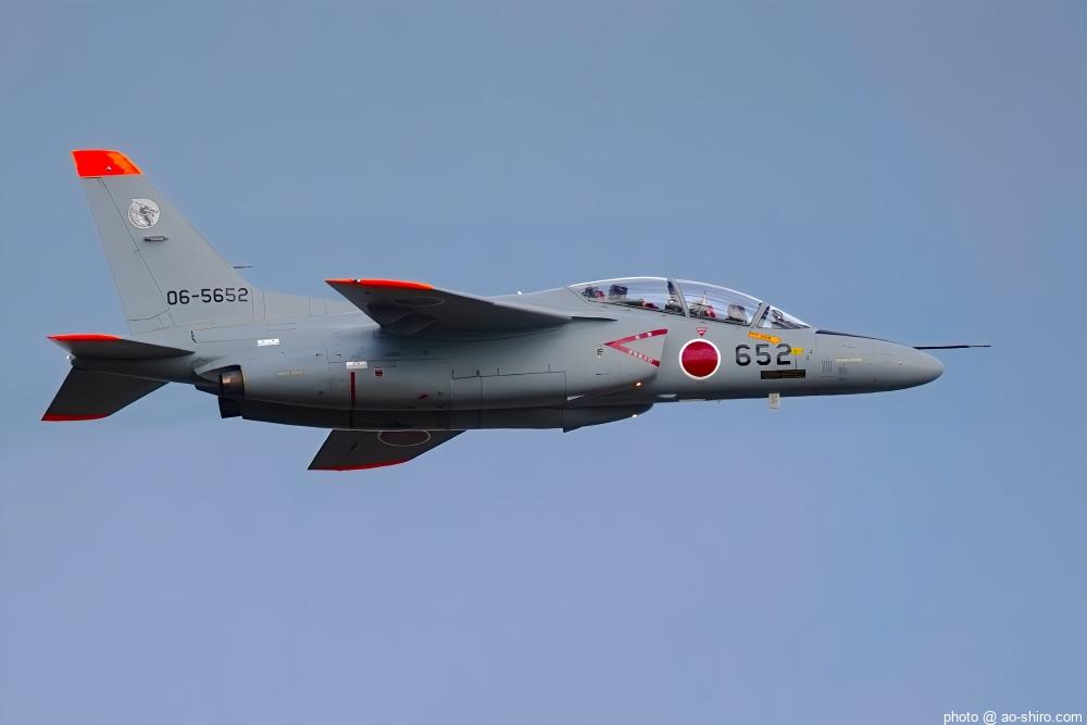 航空祭のプログラムによれば、「天候偵察」が午前7時から7時58分に実施されるとのことだったので、エプロン地区に到着時にはすでに偵察機が飛んでいると思っていた。ところが、撮影場所を確保した直後にT-4中等練習機が 1機離陸。間に合った。