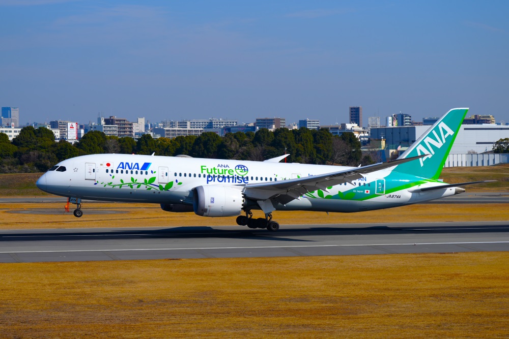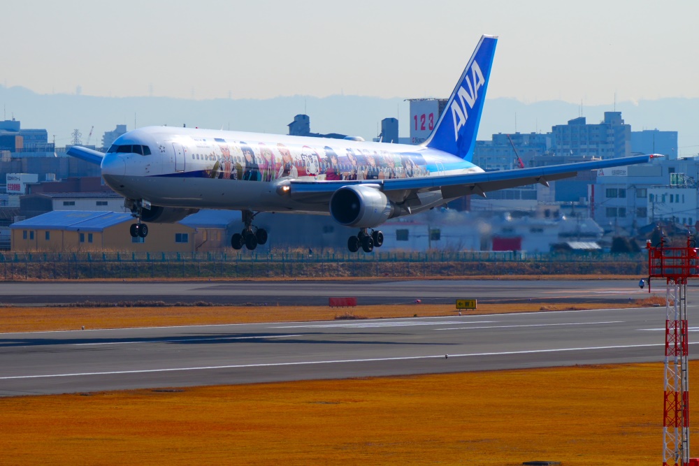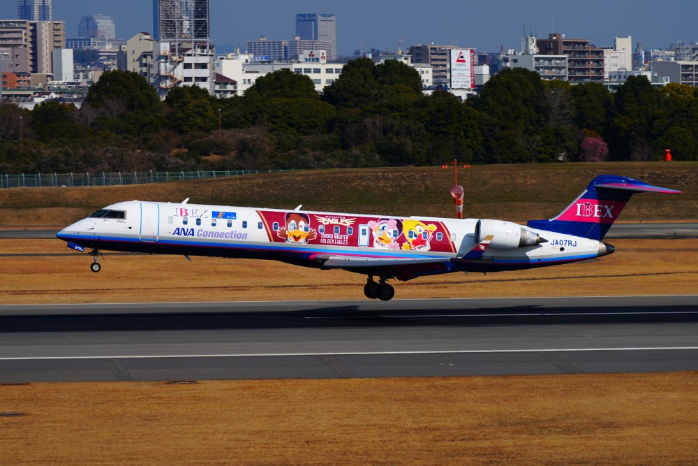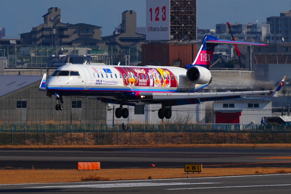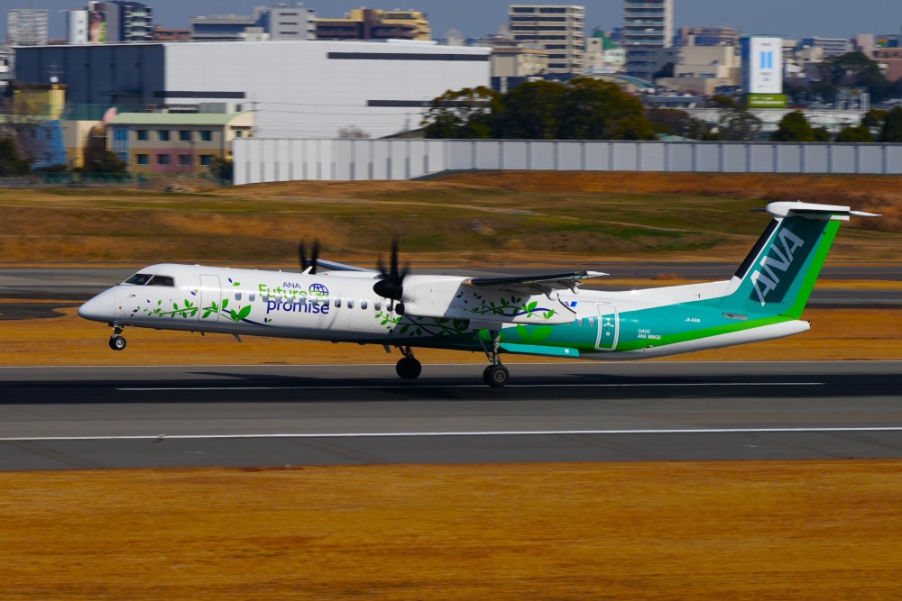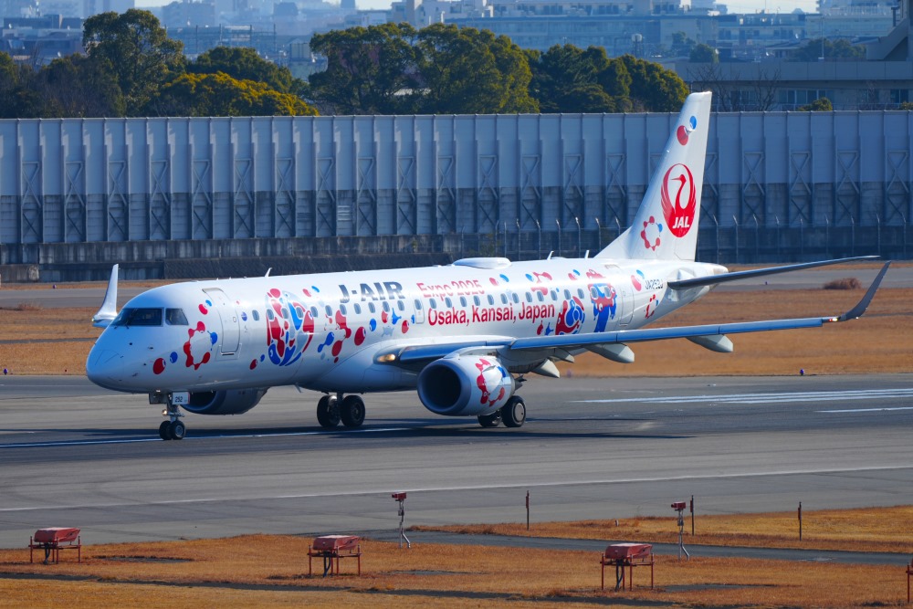 約3ヵ月ぶりのITMとあって、今まで見た/撮ったことのなかった特別塗装機(以下、「スぺマ機」)に出会うことができた。具体的には、JALの大阪万博特別塗装機の「ミャクミャクJET」、IBEXの「新・楽天イーグルスジェット」、ANAの「Future Promise Prop」の3機で、いずれも昨年の10月末~12月中旬に就航を開始していた。