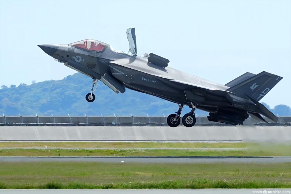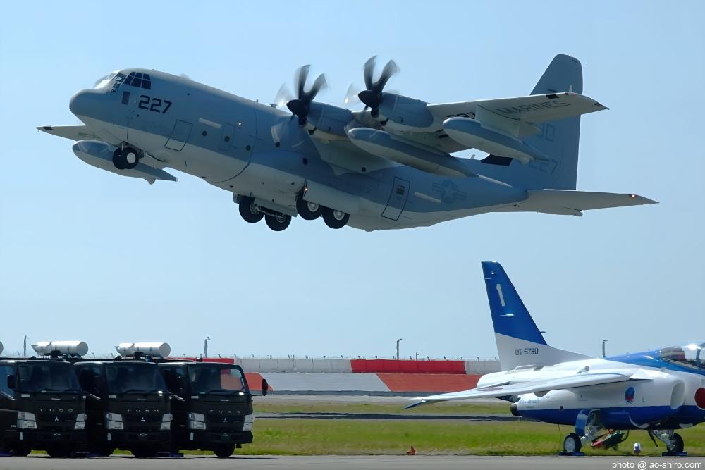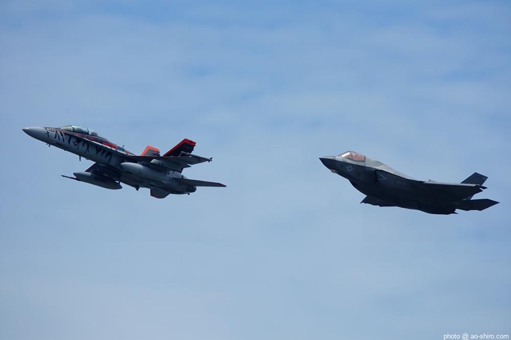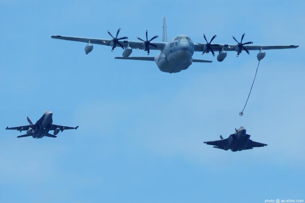 まず、KC-130空中給油・戦術輸送機が離陸。続いて ” ファイティング・ベンガルズ ” 所属の F/A-18D戦闘攻撃機 ” レガシーホーネット ” 、F-35B戦闘機 ” ライトニングⅡ ” が離陸し、空中給油のデモンストレーションや航過飛行を行った。