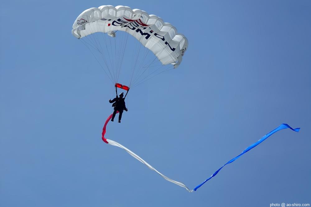 9時過ぎにKC-130が離陸、そのあと随分待たされたが「チーム・ファストラックス」のジャンパー2人がパラシュート降下してFD24の開催を祝った。FD19では、日米の国旗をつけて降下したが、今回は、日本国旗をイメージした「赤白」のリボン、米国国旗をイメージした「赤白青」のリボンをつけての降下だった。
