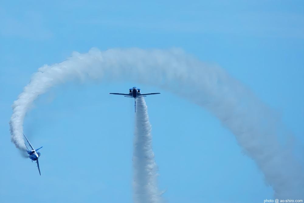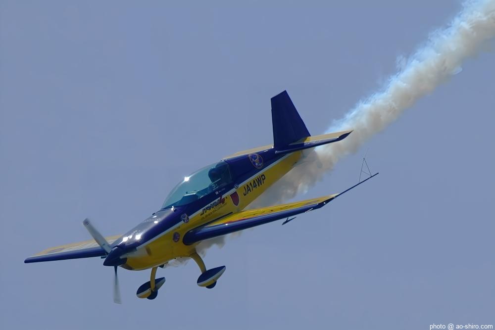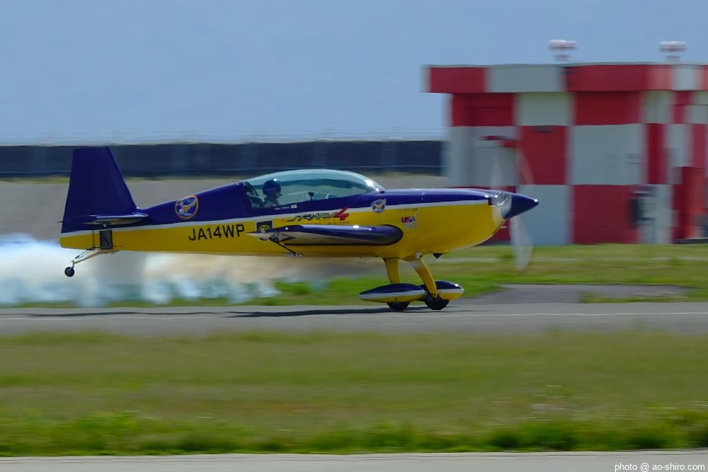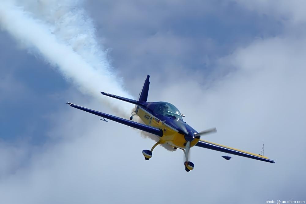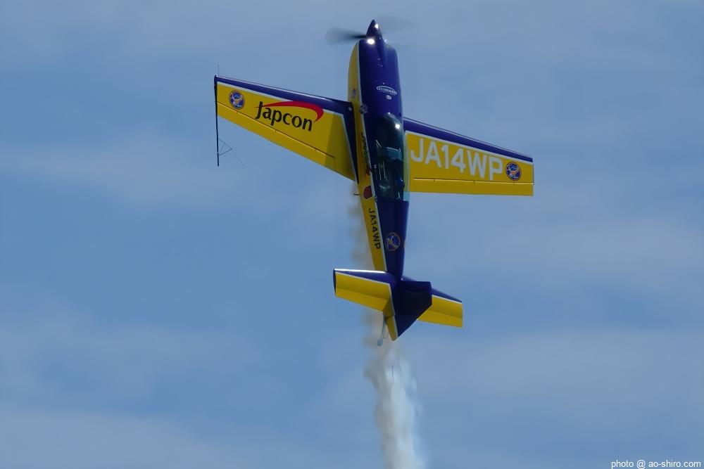 当初、プログラムの2番目は「海上自衛隊セレモニーフライト」だったが、キャンセルになったので、代わりに「ウィスキー・パパ」が1回目の曲技飛行を行った。この時点で会場正面・上空はほぼ晴れ。青空を背景に内海さんがエクストラEA-300Lを操り華麗な曲技飛行を披露してくれた。