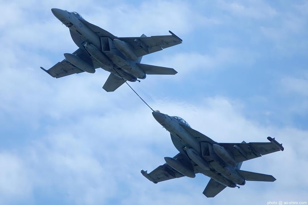 今回の目玉のひとつ、「第5空母航空団」による航過飛行が午前10時頃から始まった。映画「トップガン・マーヴェリック」で大活躍した4.5世代の戦闘機 F/A-18E/F 戦闘攻撃機 ” スーパーホーネット ” 4機とEA-18G 電子戦機 ” グラウラー ” 1機が次々に離陸し、空中給油のデモンストレーションや「タッチ&ゴー」を披露してくれた。