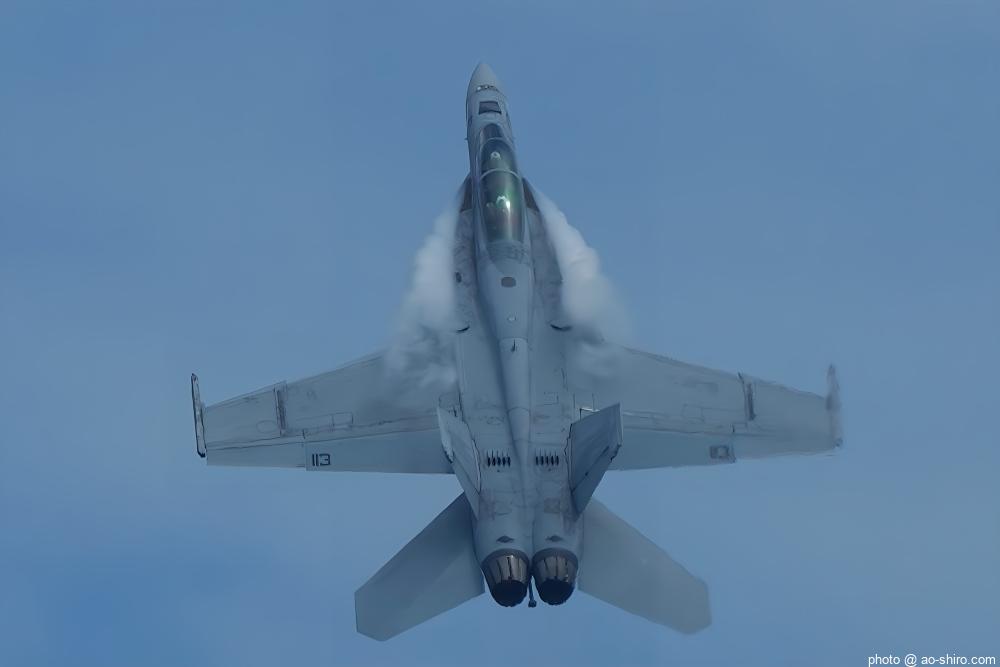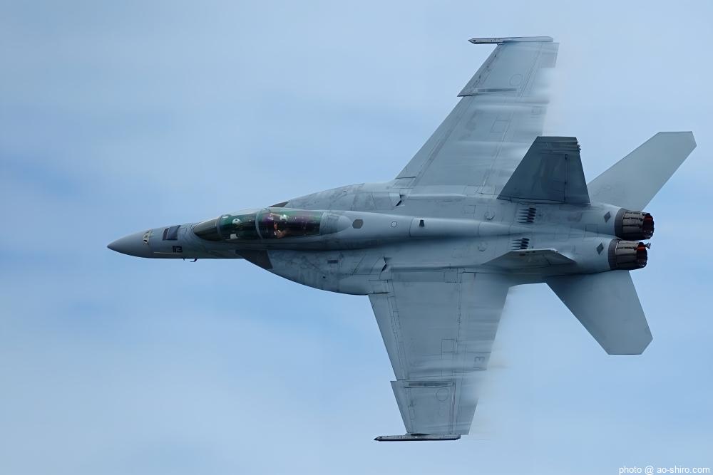 MGTFのパフォーマンスに続き、F/A-18F戦闘攻撃機 ” スーパーホーネット ” の機動飛行がはじまった。