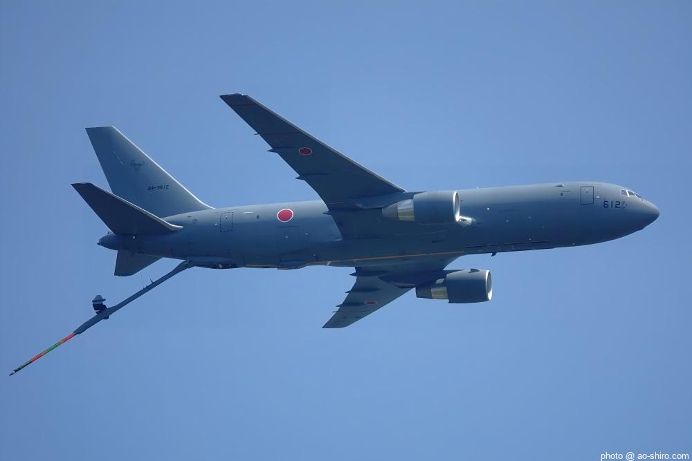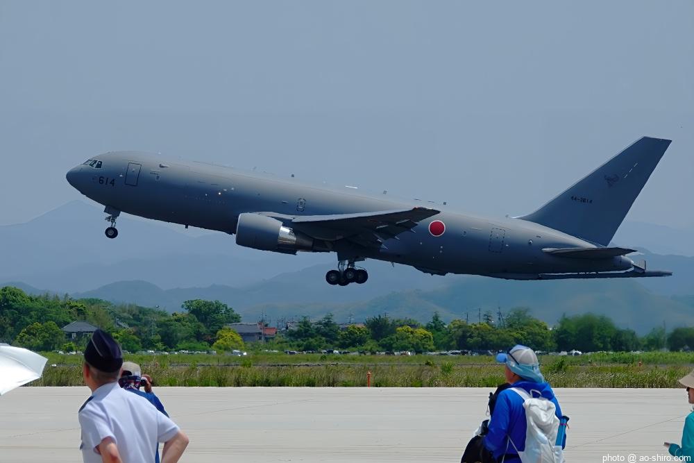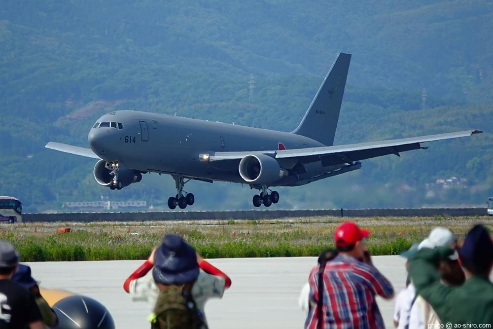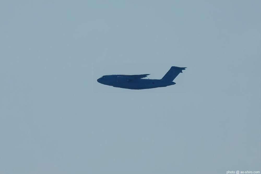 ” 所要時間 3分 “のオープニングフライトは実にあっさりしたものだった。手荷物検査の開始待ちをしていたときに離陸したC-2輸送機とKC-46A空中給油・輸送機が会場左手から飛来して右手後方に1回 航過しただけで終わり。しかも、高々度だったので” 絵になる “写真は撮れなかった。