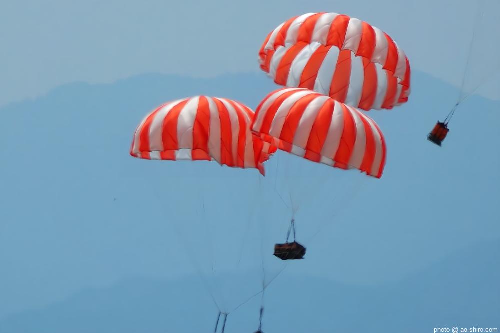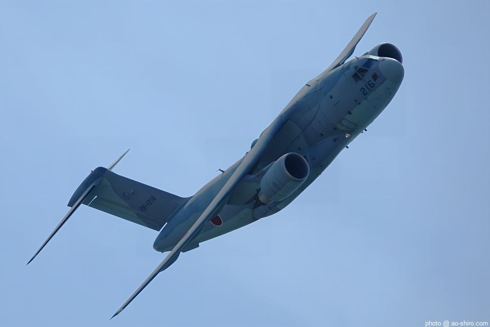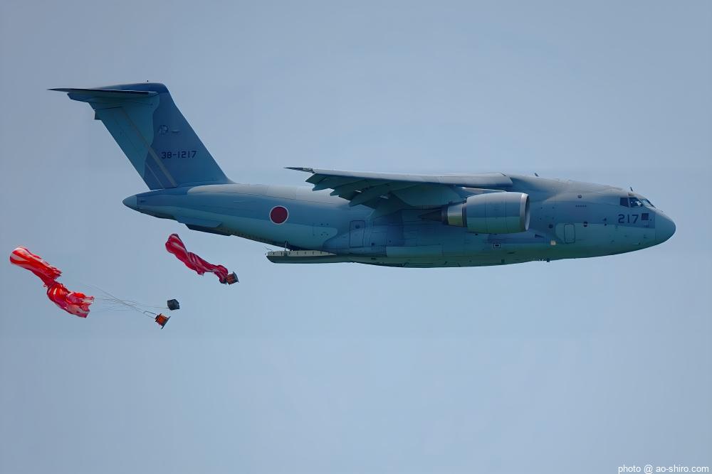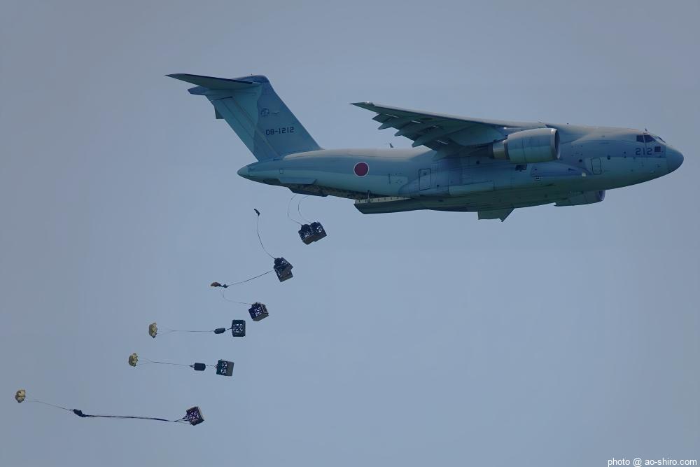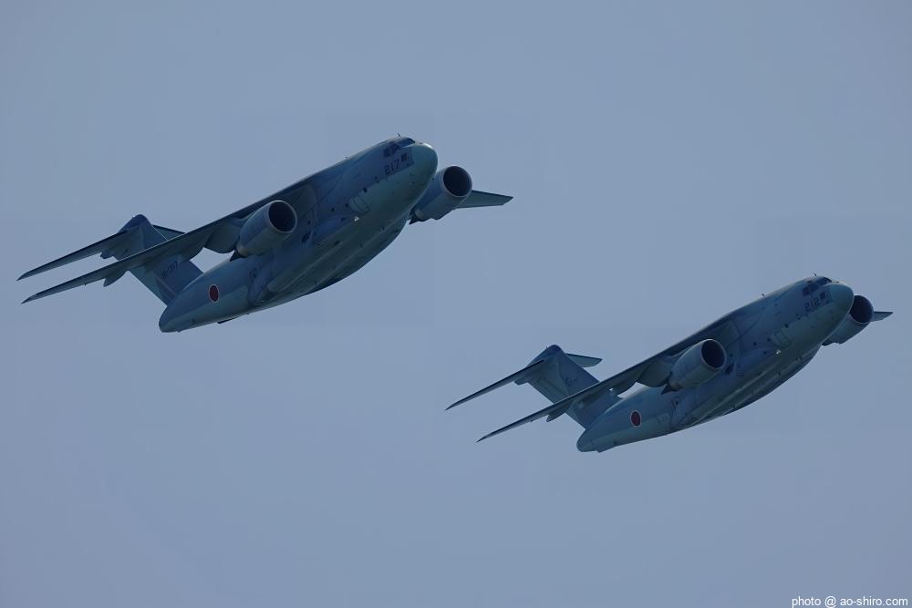 今回の航空祭の最大の目玉が、地元機のC-2輸送機 ” ブルーホエール ” の飛行展示。2機編隊で飛行したり、ランディング・ギアを降ろして航過・急上昇したり、貨物扉から救難物資を投下したりした。