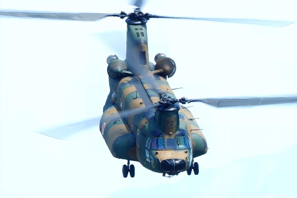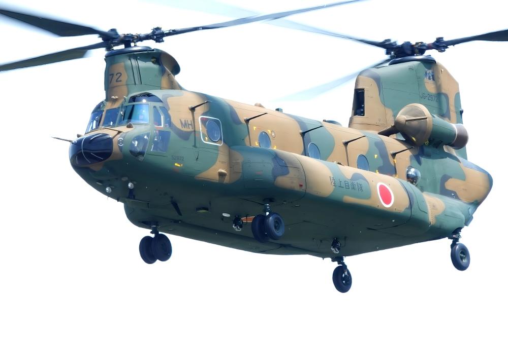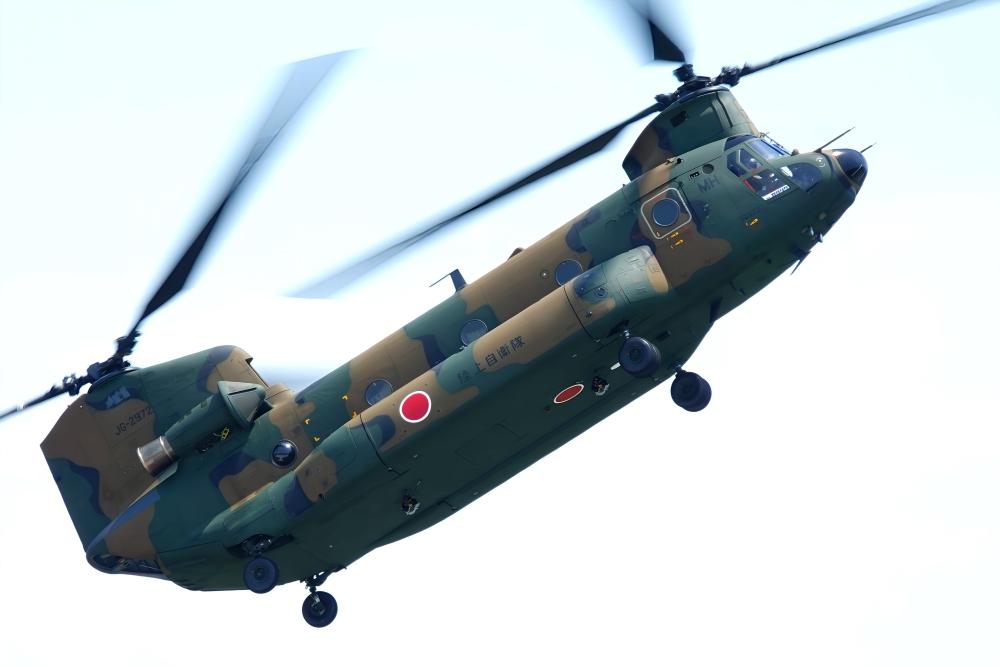 陸上自衛隊のCH-47JA輸送ヘリコプター ” チヌーク ” は、機体を大きくバンクさせて旋回したり、機首を下げて飛行したり、急角度で上昇したりした。