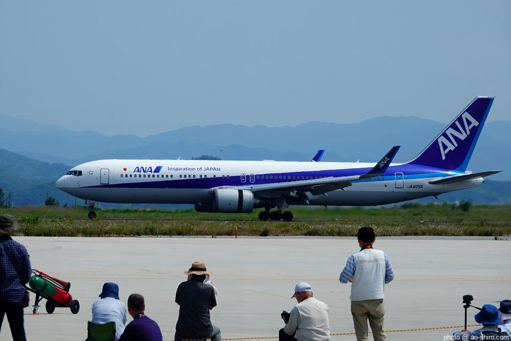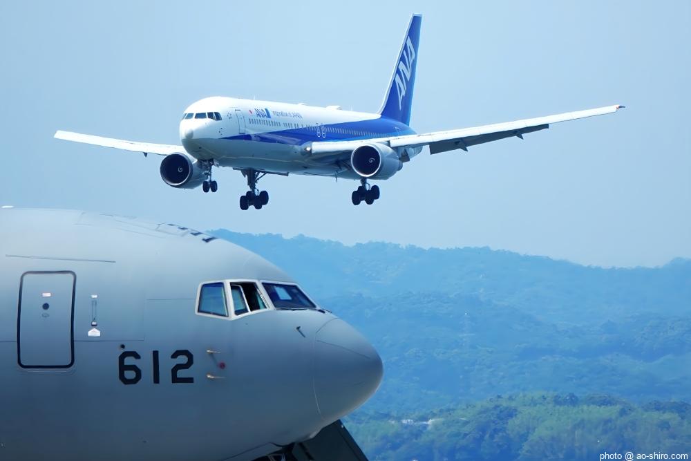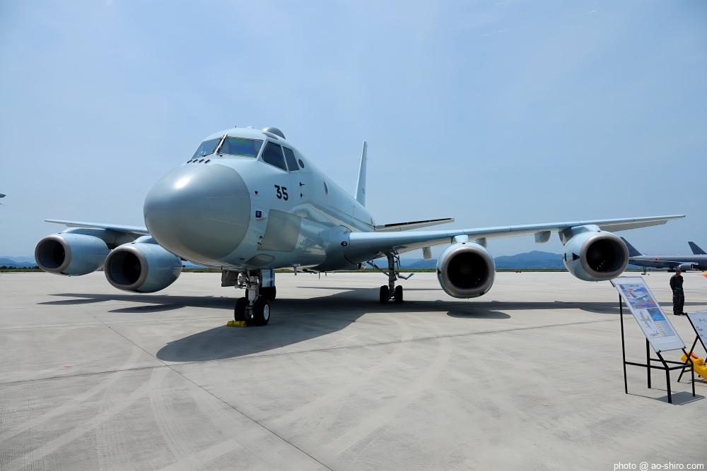 美保基地は、民間の「米子空港(通称『米子鬼太郎空港』)」と滑走路を共用しているので旅客機の離発着がある。地上展示機が邪魔で撮りにくかったがしかたがない。