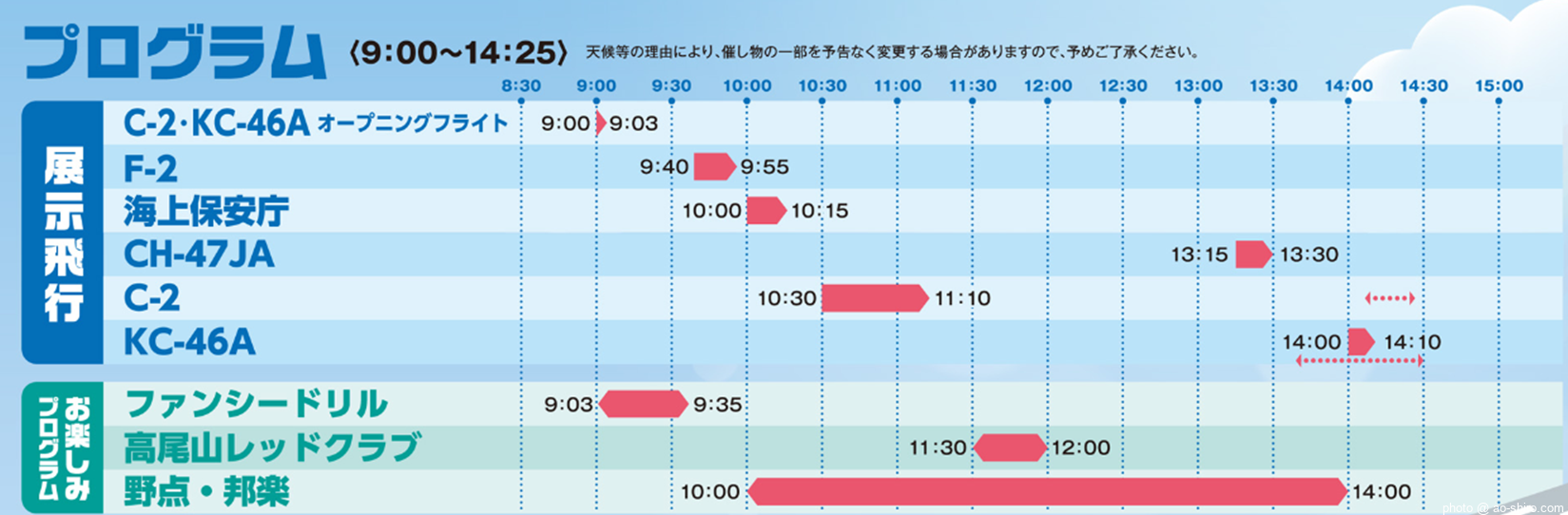 それでもプログラムにはC-2とKC-46Aの午後の部分に意味不明の《矢印+点線》が表示されていた。そこで、ご迷惑ながら美保基地に電話で問合せをしたところ、正確な時間は確定していないが《矢印+点線》の時間帯にC-2、KC-46Aが飛ぶ予定であることが分かり、少しホッとした。