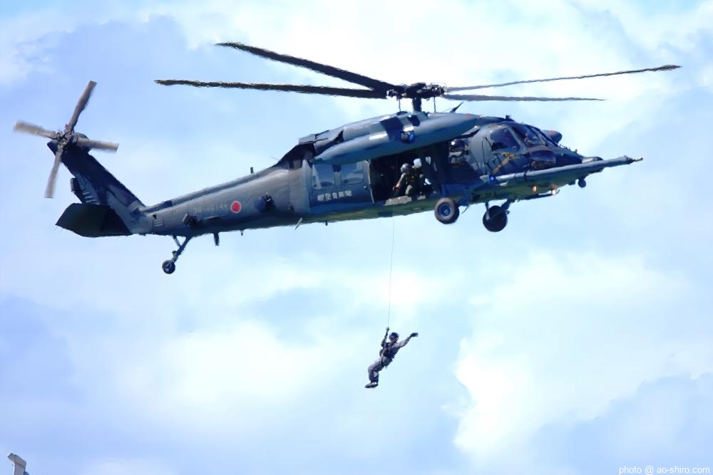 U-125A救難捜索機が会場上空を旋回する中、UH-60J救難ヘリコプターが地上の要救助者の救出シーンを再現した。