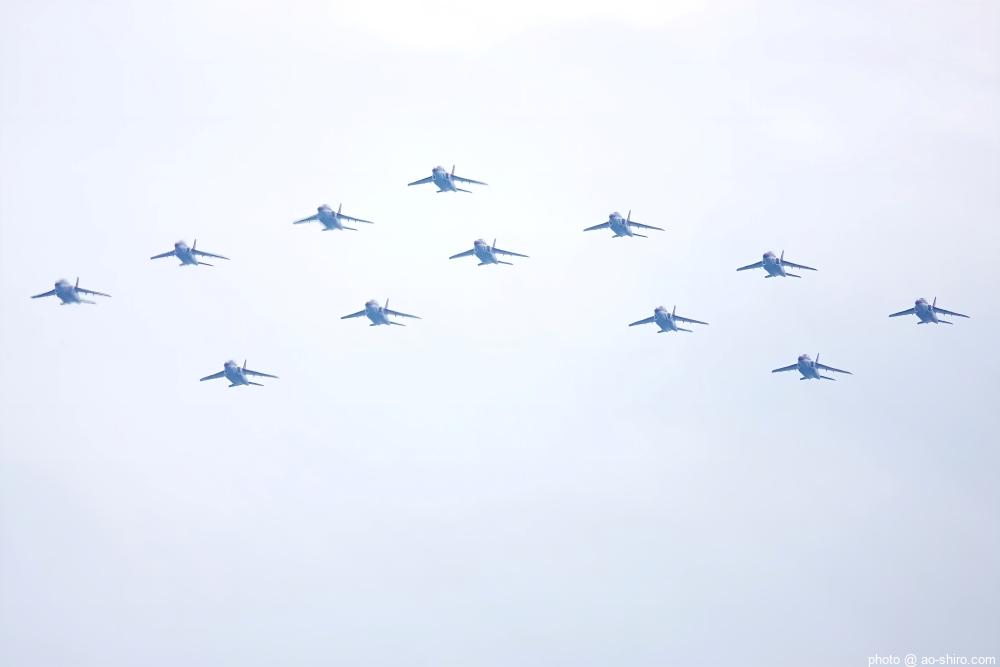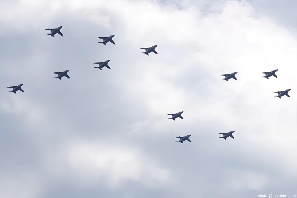 最後は、T-4中等練習機 12機による編隊飛行。隊形を変えて 2回ほど航過飛行を行った。