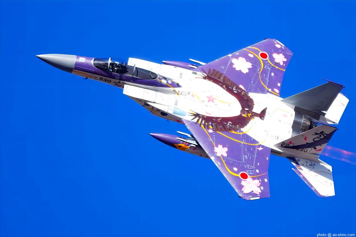北陸新幹線カラーをイメージした第 303飛行隊の F-15Jと和風テイストのカラーリングが映える第 306飛行隊の F-15Jが青空を背景に展開した機動飛行は、 ” 背中見せ見せ ” で迫力満点だった。