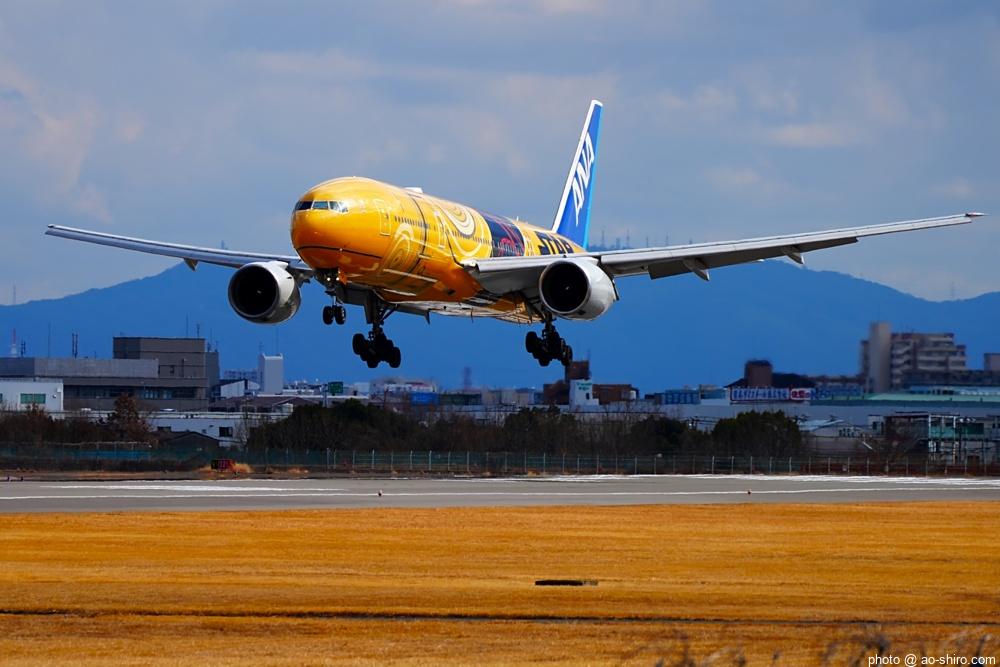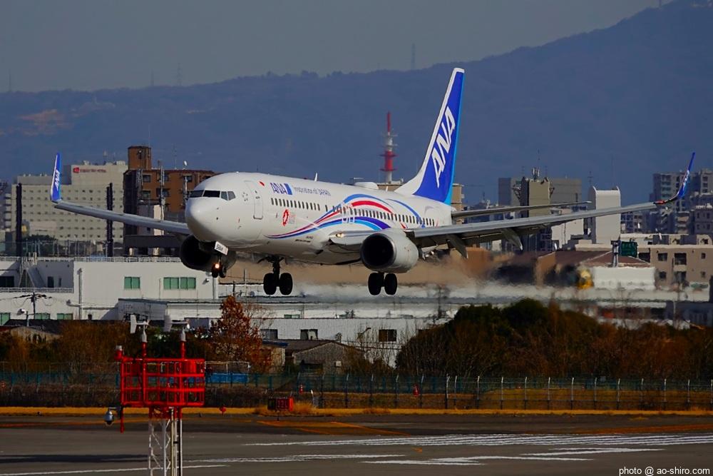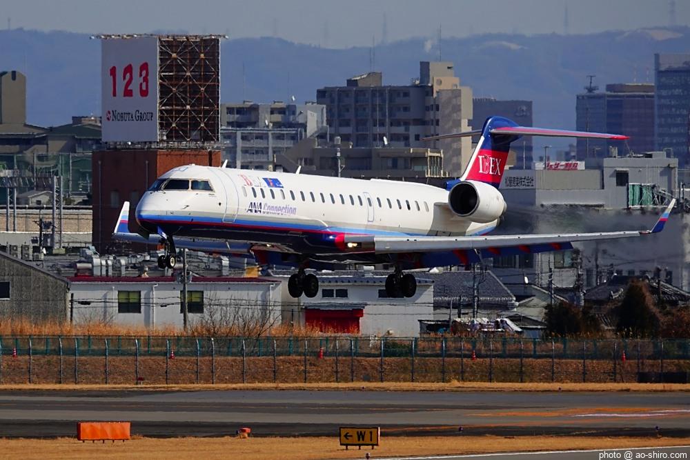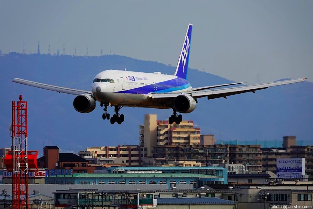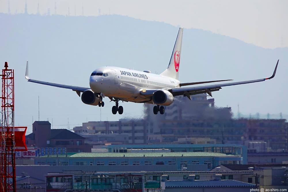 この日、最初にITMにやってきたのは午前中。まだ日が陰っていたので寝ぼけたような写真しか撮れなかった。ところが、ITMを離陸したこの機が午後2時前にふたたび飛来してきたので、好条件のもと、キリリと引き締まった写真を撮ることができてよかった。