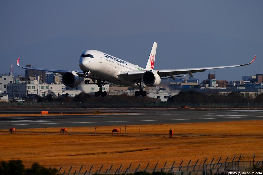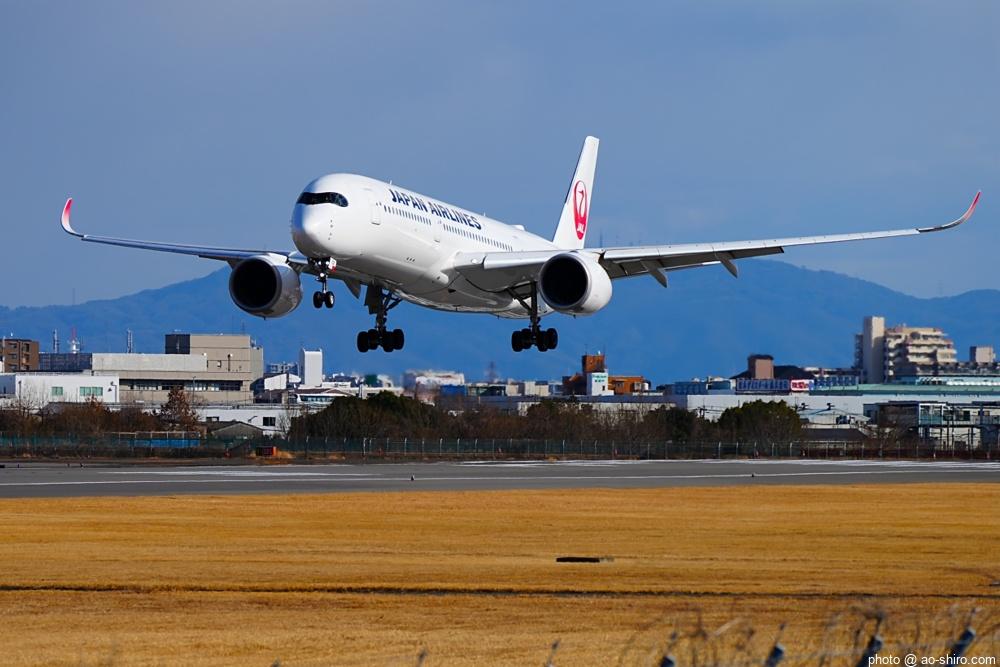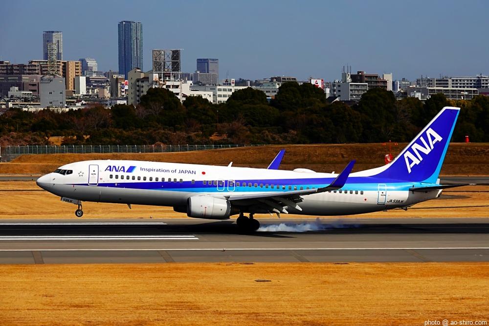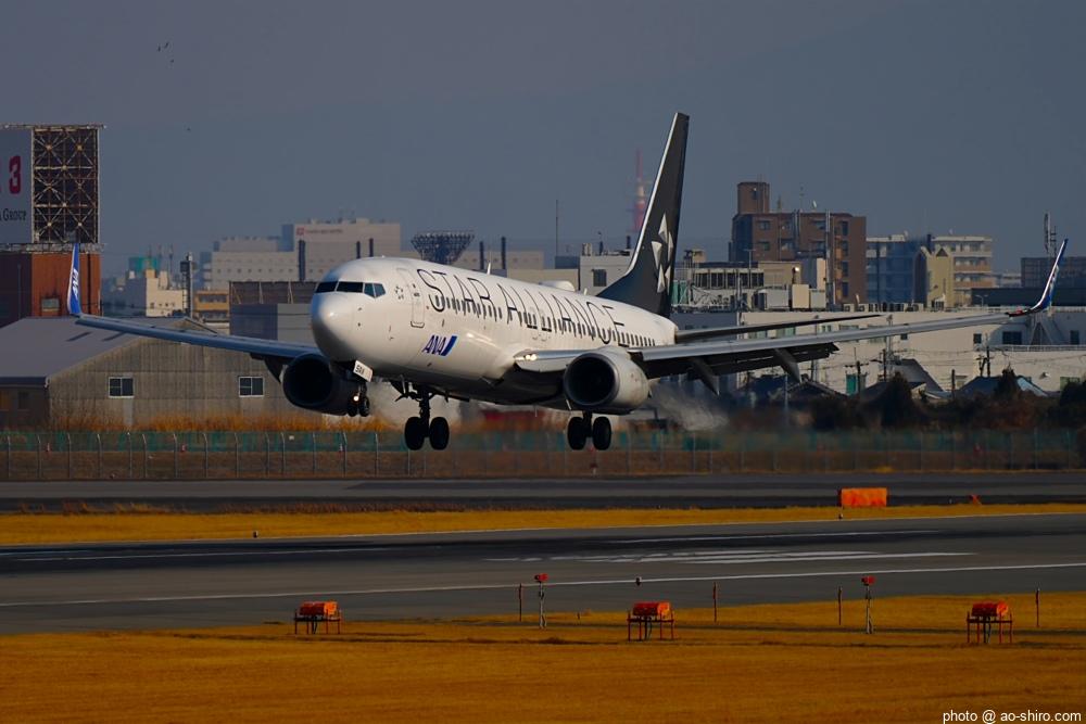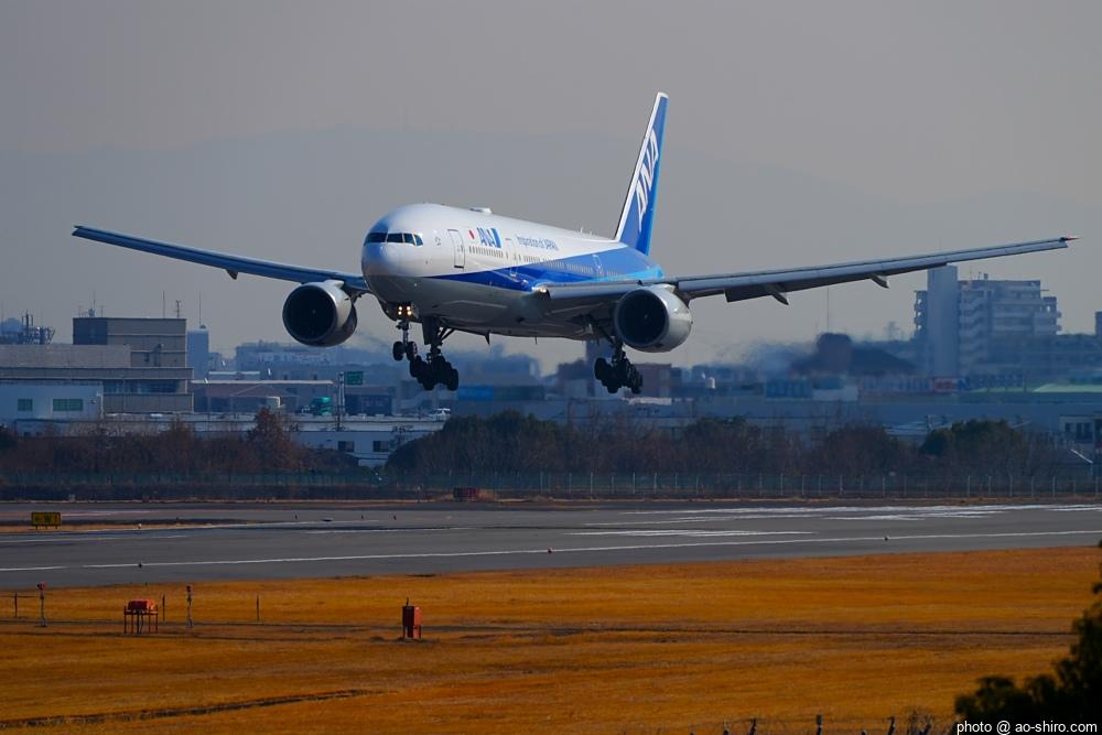 この日、最初にITMにやってきたのは午前中。まだ日が陰っていたので寝ぼけたような写真しか撮れなかった。ところが、ITMを離陸したこの機が午後2時前にふたたび飛来してきたので、好条件のもと、キリリと引き締まった写真を撮ることができてよかった。