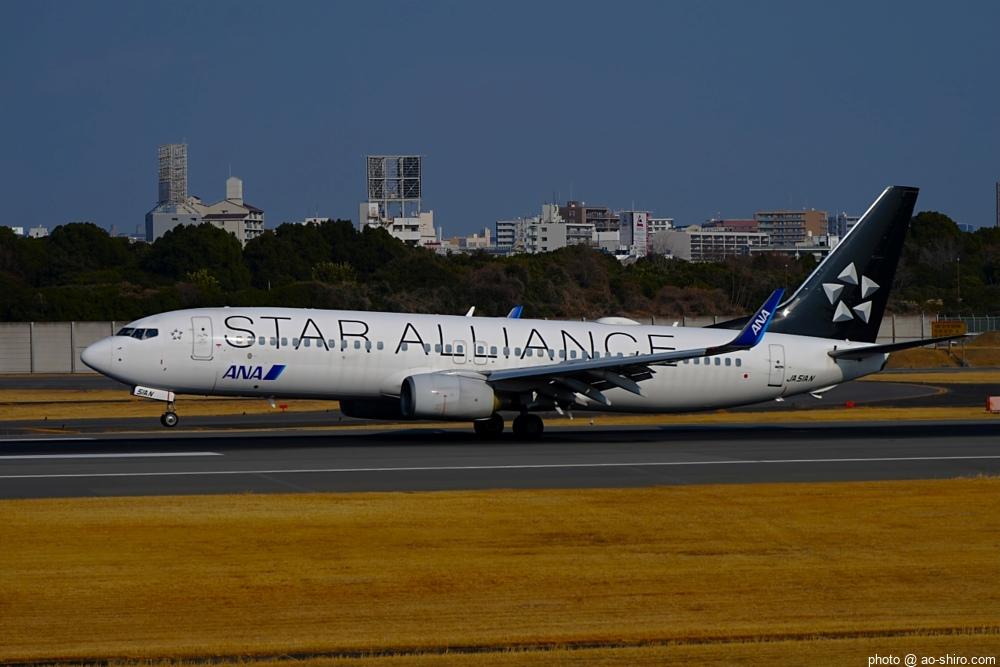 那覇空港(OKA)からやってきたA350を撮り、” B737 EXPO ANA JET ” の2度目の撮影がうまくいったので、午後2時過ぎにカメラをリュックにしまい、上機嫌で引き上げる寸前だった。ふと南の方を見ると遠くから近づく着陸灯が見えたので、思い直してカメラを出して構えていたら、なんと私の ” イチオシ ” の B737 スターアライアンス塗装機だった。