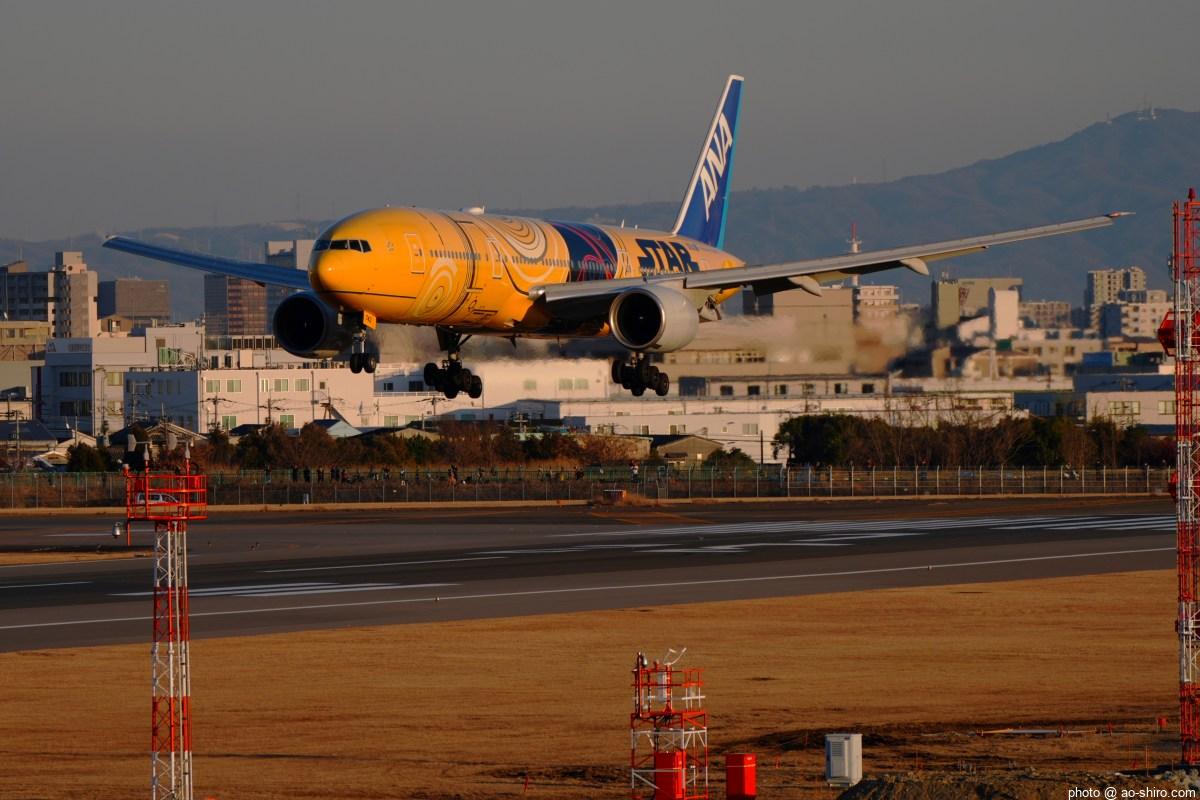 今回の主目的は、 3月の小松基地航空祭に向けて新カメラの使い方をマスターすることだったが、 3日後に就航を終える ” C-3PO ANA JET(以下、「C-3POJ」)がITMに飛来する最後の日だったので、ラストショットの撮影にも挑戦した。