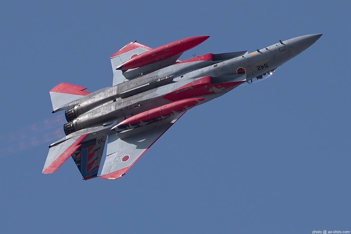 F-15Jは模擬空中給油に続いて機動飛行を実施し、8字旋回などを披露。背中も見せてくれたが、レンズの望遠端が600mm(APS-Cクロップ時)で足りず超々々トリミングが必要な写真ばかりだった。