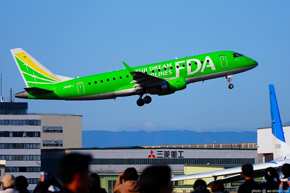 航空祭撮影の合間に名古屋空港を離陸するフジドリームエアラインズの旅客機E175や周辺を飛行するヘリコプターを撮った。