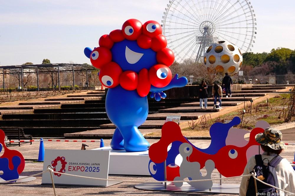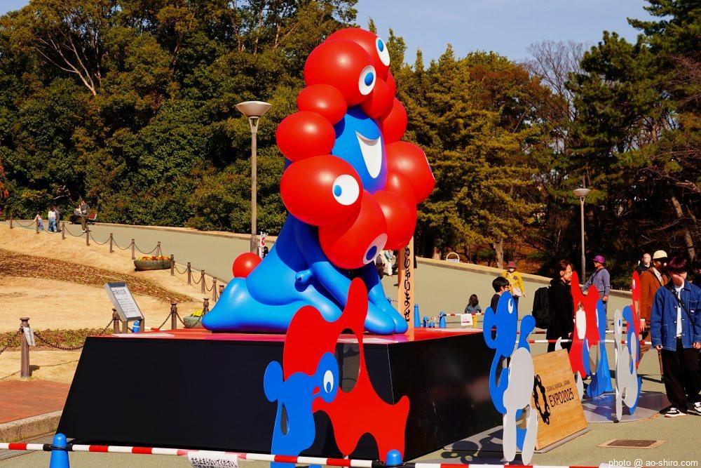 期間限定で設置されていた「大阪・関西万博2025」イメージキャラクター ” ミャクミャク ” の像 2体や各所で咲いていた花々、上空を飛んでいたドクターヘリ、大阪モノレールの「ガンバ大阪号」などの写真を撮った。