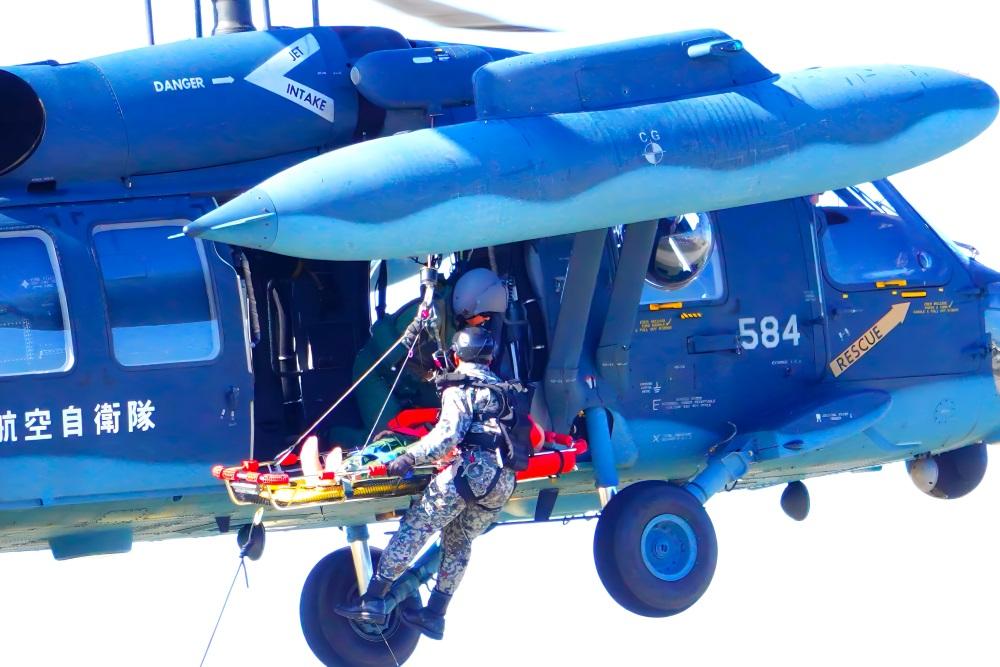 UH-60J救難ヘリコプターがKC-130H空中給油・輸送機と組んだ空中給油の場面や要救助者を救助する場面を披露した。