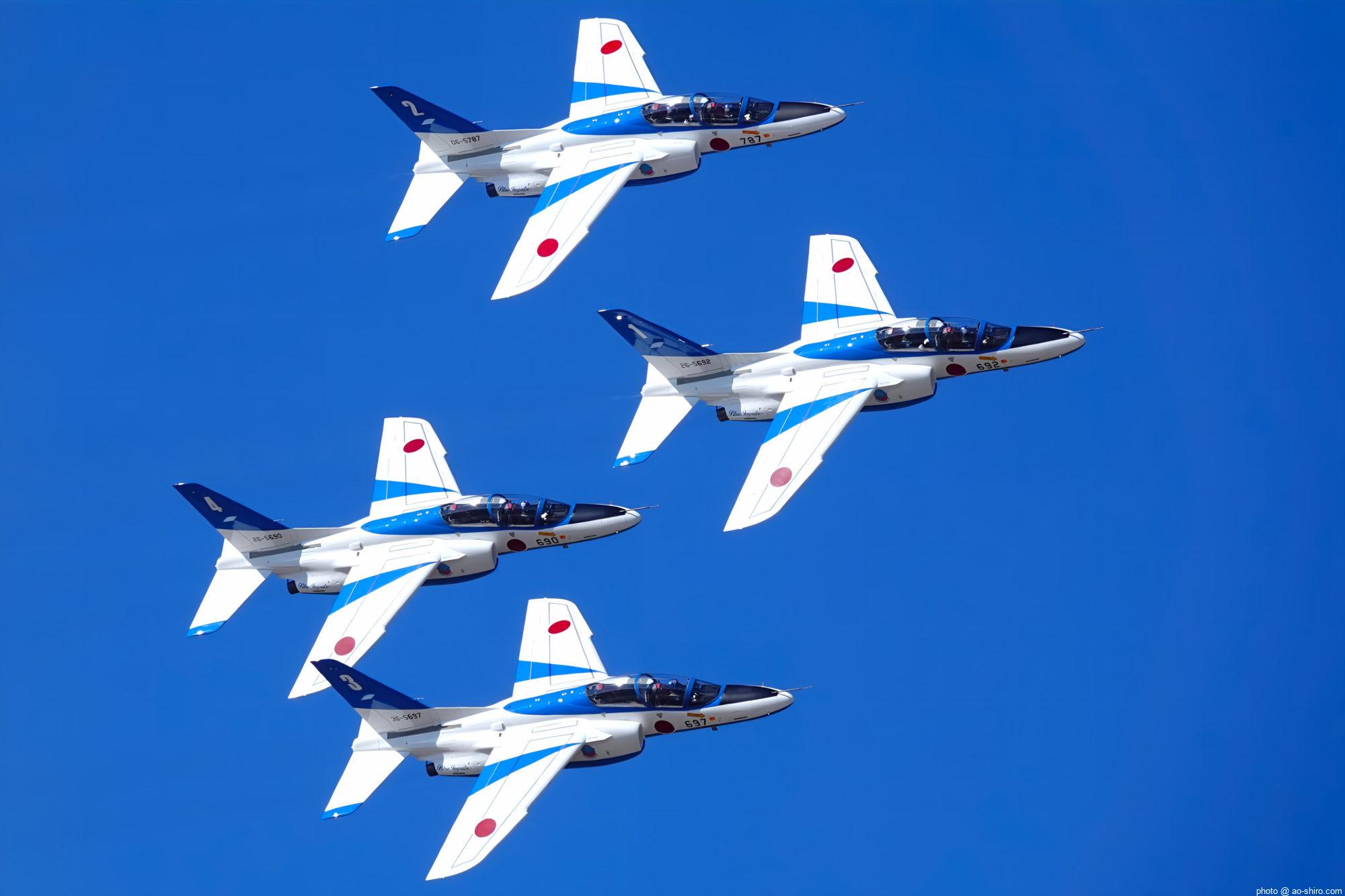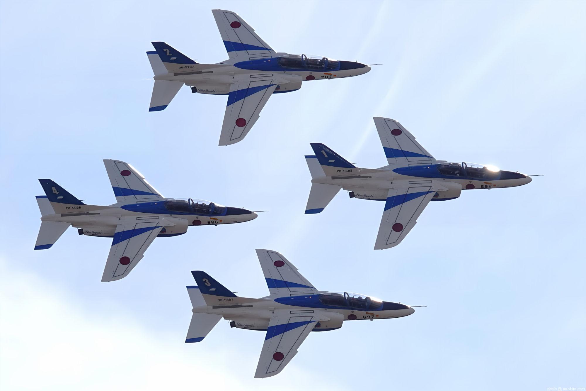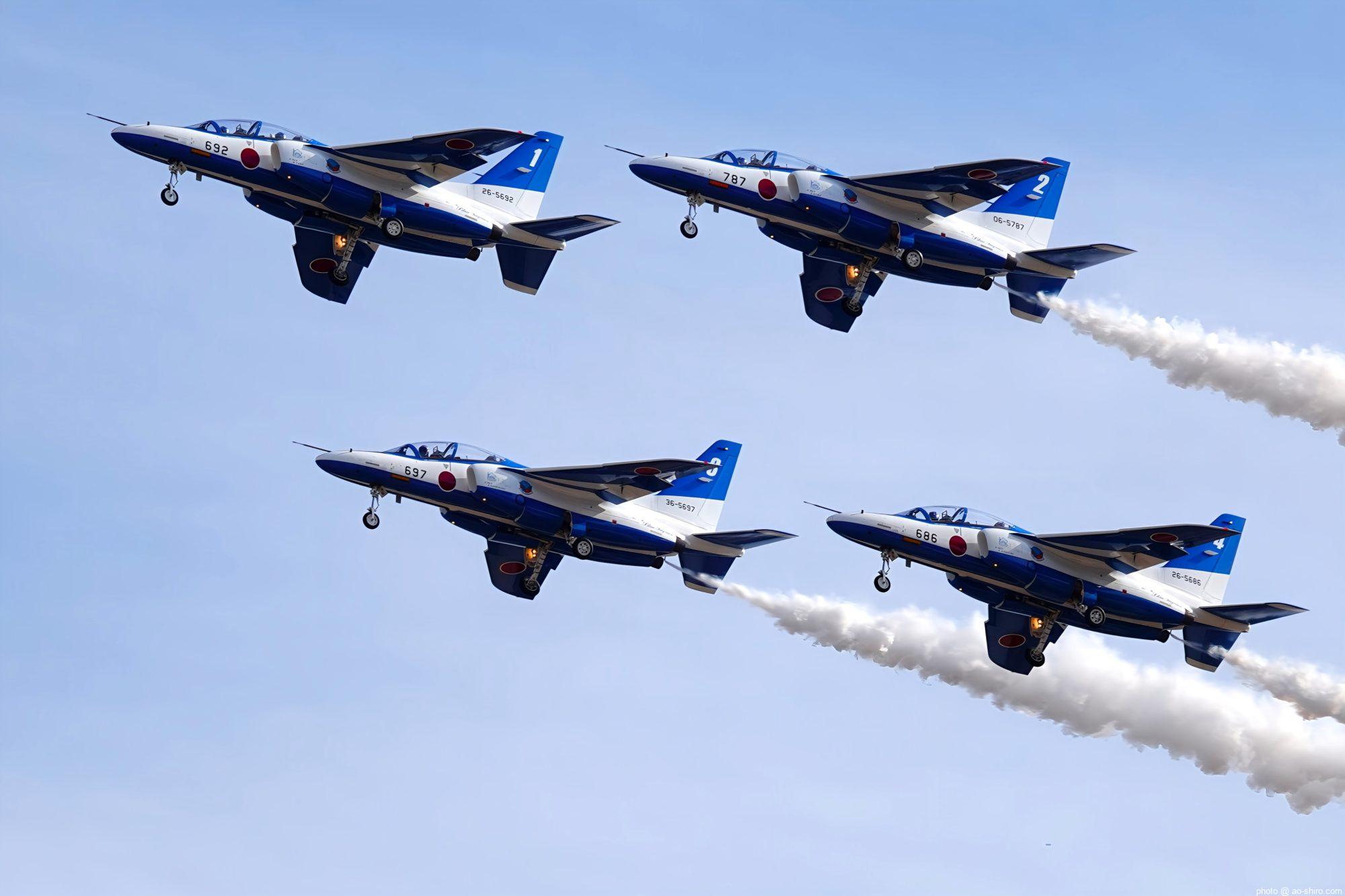 好天に恵まれてF-2Aの機動飛行を撮りきれて大満足だったが、さらに、地元の航空祭では地上展示だけだった芦屋基地所属のT-4中等練習機(70周年記念塗装機)