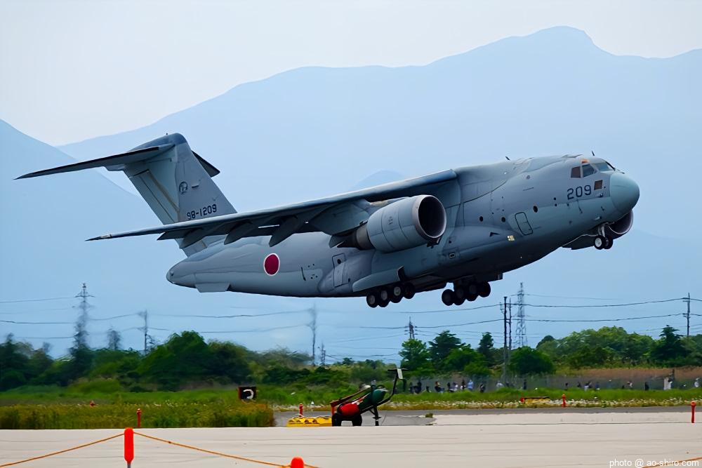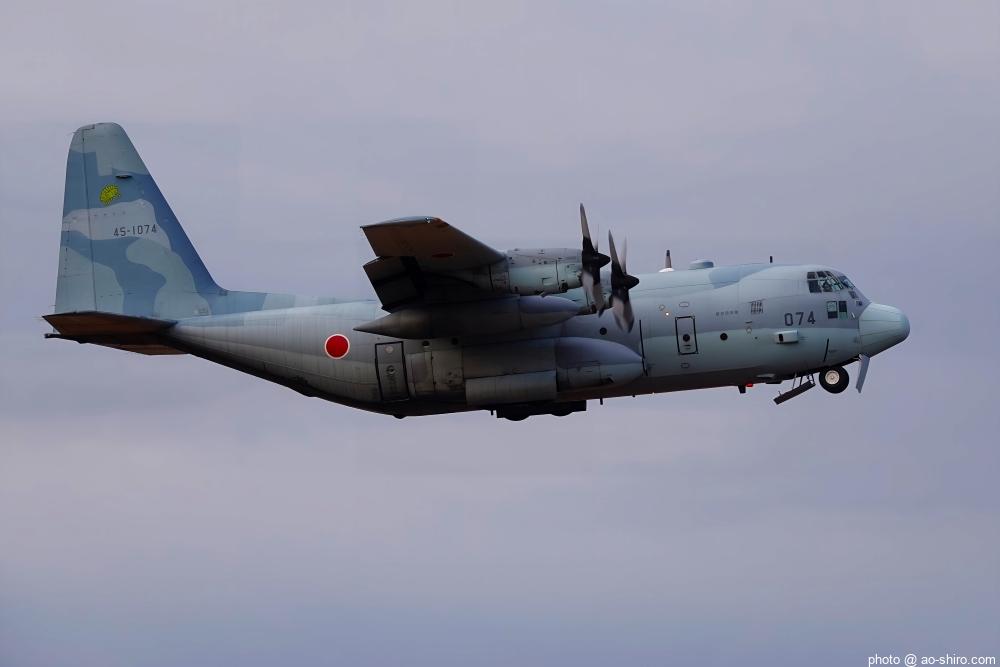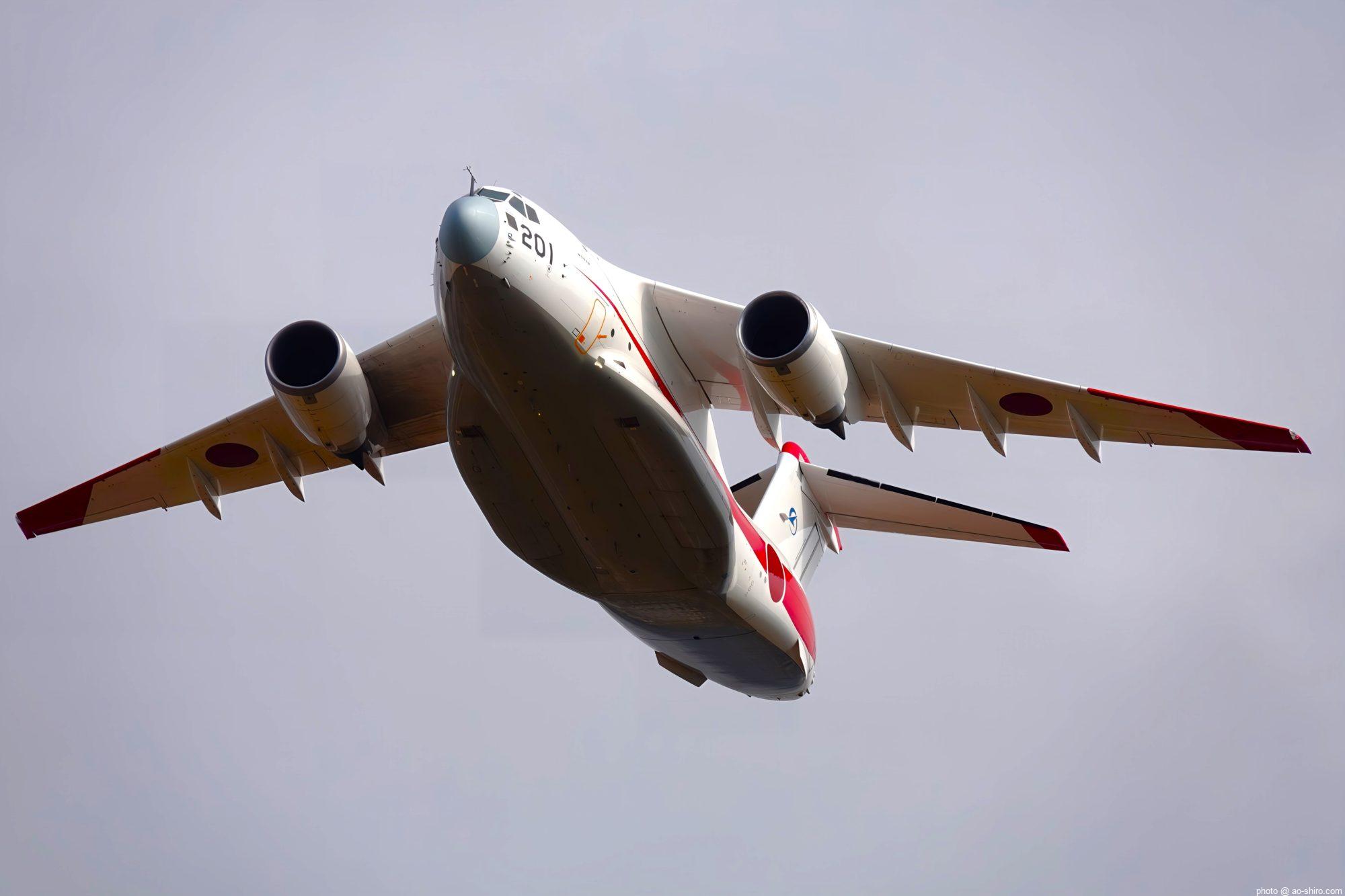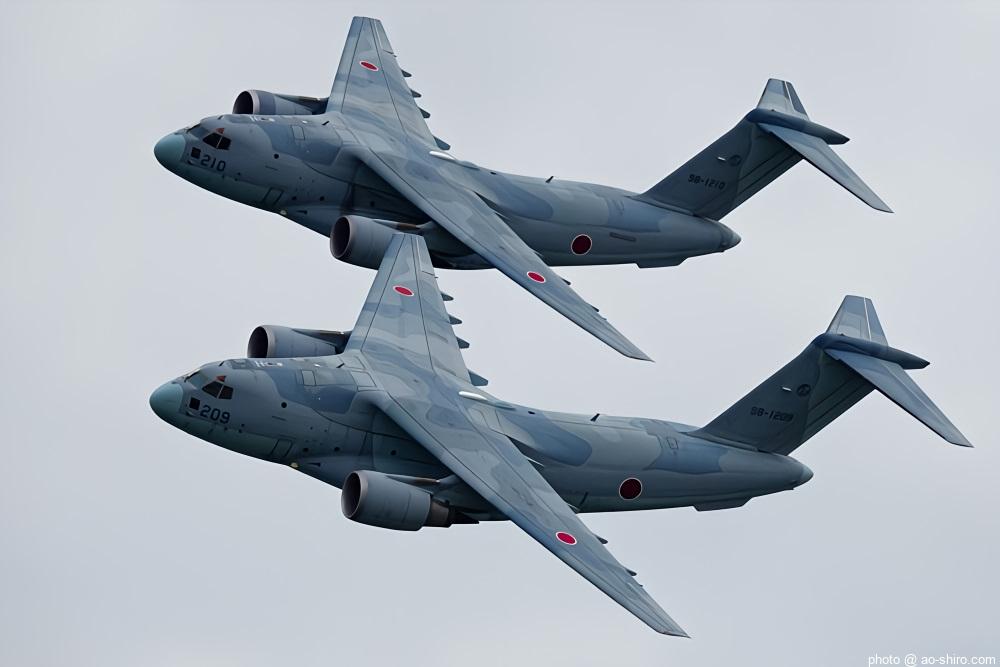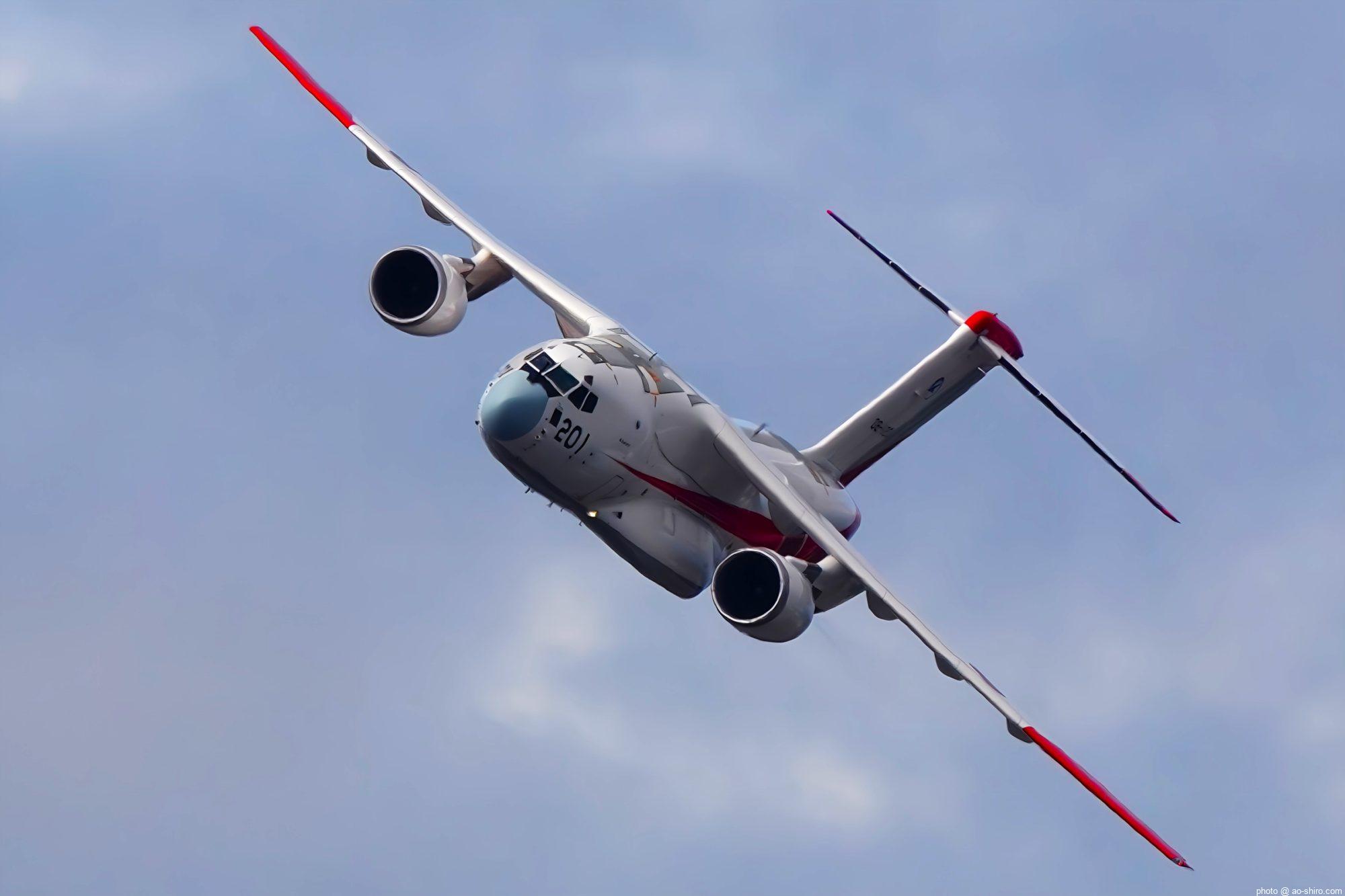 当初は、午後のプログラムで機動飛行をする予定だったが、天候悪化の予報から午前中に前倒しになった。おかげで、晴天下で背中もバッチリ撮ることができた。午後は、曇ってきてメリハリのある写真が撮りづらくなったが、それでも今年度で退役するC-1輸送機の試作機 ” 銀ちゃん ” や後輩のC-2輸送機の試作機の機動飛行も撮れたので、大満足。